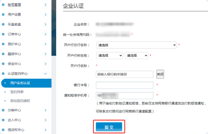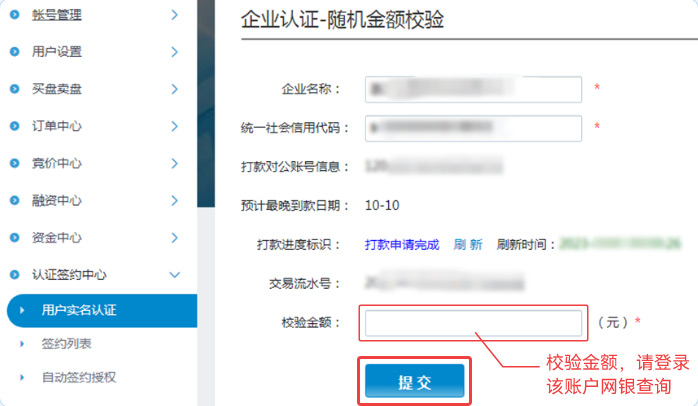 03企业信息认证,填写后提交,并进行随机金额校验